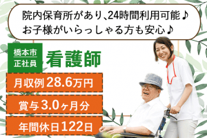 ≪橋本市/看護師/正社員≫◆月収例28.6万円☆賞与3.0ヶ月分☆年間休日122日☆単身用住宅有☆院内保育あり◆訪問看護ステーションでのお仕事です☆(wak)