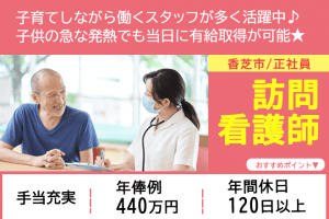 ≪香芝市/訪問看護師/正社員≫★手当充実◎年間休日120日以上◎年俸例440万円◎日勤のみ★訪問看護ステーションでのお仕事です☆(kyo)