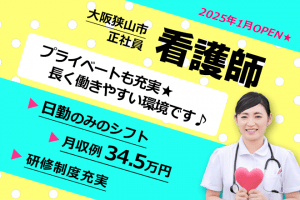≪大阪狭山市/看護師/正社員≫★月収例34.5万円♪日勤のみ♪オープニングスタッフ♪研修制度充実★特別養護老人ホームでのお仕事です☆(osa)
