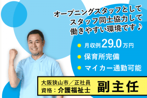 ≪大阪狭山市/副主任(介護福祉士)/正社員≫★保育所完備◇月収例29万円~◇新しい施設◇賞与あり★特別養護老人ホームでのお仕事です☆(osa)