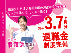 ≪和歌山市/看護師/正社員≫◆賞与3.7ヶ月分★退職金制度完備★有給休暇の消化率90%以上★OJT・院内外研修あり☆残業少しだけ★家族手当あり◆病院でのお仕事です☆(wak)