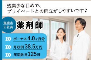 ≪海南市/薬剤師/正社員≫★年間休日125日◇賞与4.0ヶ月分◇月収例39.5万円◇残業ほぼなし★病院でのお仕事です☆(wak)