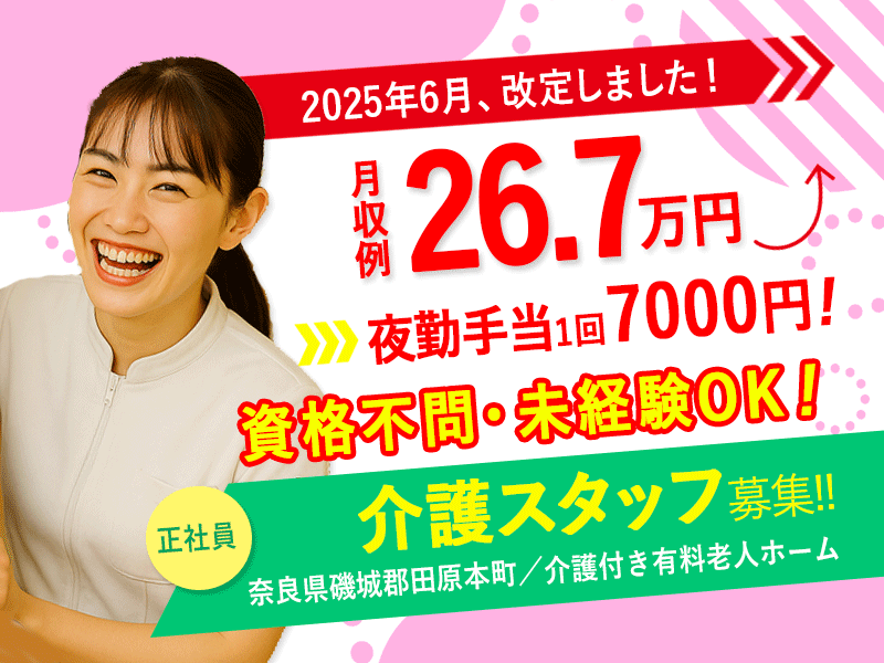 ≪磯城郡/無資格・未経験OK介護士/正社員≫★給与改定!2025年6月~さらに高待遇に!月収例26.7万円♪年間休日156日★介護付有料老人ホームでのお仕事です☆(kyo)