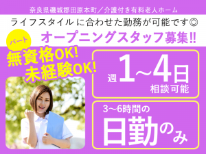 ≪磯城郡/経験不問の介護士/パート≫★【給与改定】2025年6月~さらに高待遇に◎2024年9月にオープンした新しい施設◎1日3~6時間で勤務時間が選べる◎週1日から4日勤務が可能★介護付有料老人ホームです☆(kyo)