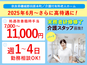 ≪磯城郡/実務者研修修了/パート≫★【給与改定】2025年6月~さらに高待遇に!◎駅徒歩1分◎週1~4日OK◎1日3~6時間で勤務時間が選べる★介護付有料老人ホームでのお仕事です☆(kyo)