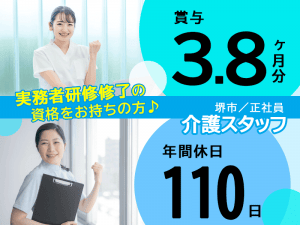 ≪堺市/実務者研修修了/正社員≫★賞与3.8ヶ月分♪月収例25.7万円~♪年間休日110日♪月8~10日休み◎託児施設あり★老健でのお仕事です☆(osa)
