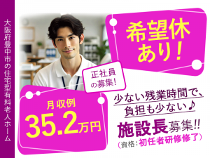 ≪豊中市/施設長(初任者研修修了)/正社員≫★希望休あり♪月9日休♪資格取得支援♪賞与2.0ヶ月分◎月収例34万円★住宅型有料老人ホームでのお仕事です☆(osa)