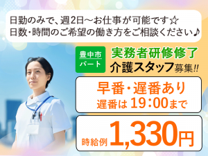 ≪豊中市/実務者研修修了/早番・遅番パート≫◆年1回昇給あり♪日勤のみ♪寸志あり♪勤務日相談OK☆時給例1,330円◆サービス付き高齢者向け住宅でのお仕事です☆
