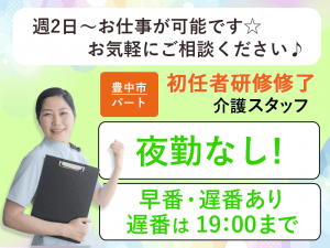 ≪豊中市/初任者研修修了/早番・遅番パート≫◆時給例1,280円◎勤務日相談OK◎夜勤なし◎年1回昇給あり♪日勤のみ♪寸志あり◆サービス付き高齢者向け住宅でのお仕事です☆