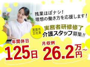 ≪箕面市/実務者研修修了/正社員≫◆ライフワークバランス重視派に!年間休日125日♪月収例26.2万円~♪残業ほぼなし♪夜勤の相談OK♪6年間毎年5,000円の昇給◆サービス付き高齢者向け住宅でのお仕事です☆(osa)