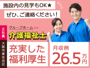 ≪東住吉区/介護福祉士/正社員≫★月収例27.0万円~◎企業主導型保育所利用OK◎施設内見学OK◎残業ほぼなし◎グループホームでのお仕事です☆(osa)