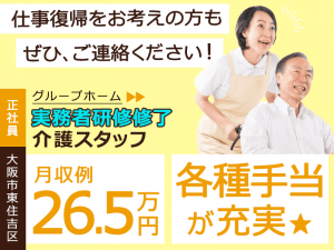 ≪東住吉区/実務者研修修了/正社員≫★月収例25.1万円~◎残業ほぼ無し◎託児施設あり◎各種手当充実◎グループホームでのお仕事です☆(osa)