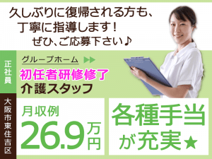 ≪東住吉区/初任者研修修了/正社員≫★月収例24.7万円+別途手当あり♪残業ほぼ無し♪保養所やBリーグ観戦チケットなど福利厚生充実◎畑のある地域に密着したグループホームでのお仕事です☆(osa)