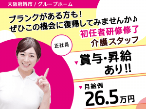 ≪堺市/初任者研修修了/正社員≫★月給例24.7万円◎別途処遇改善手当あり!年2回・年計約31万円◎福利厚生充実!子育て支援もあり★グループホームでのお仕事です☆(osa)