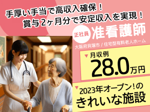 ≪貝塚市/准看護師/正社員≫★2023年オープンのきれいな施設☆月収例28.0万円☆賞与2ヶ月分☆退職金制度あり★住宅型有料老人ホームでのお仕事です☆(osa)