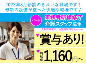 ≪貝塚市/実務者研修修了/パート≫★2023年8月新設◎時給例1,220円~♪賞与あり◎資格取得支援◎夜勤ナシ★住宅型有料老人ホームでのお仕事です☆