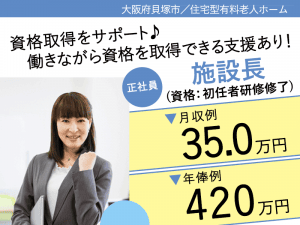 ≪貝塚市/施設長(初任者研修修了)/正社員≫★資格取得支援◇年俸制420万円◇夜勤なし◇退職金制度◇月収例35.0万円◎研修制度充実◎2023年OPEN★住宅型有料老人ホームでのお仕事です☆(osa)
