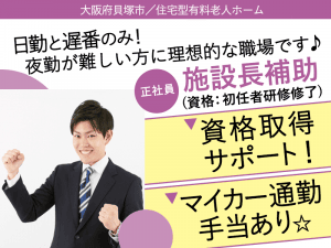 ≪貝塚市/施設長補助(初任者研修修了)/正社員≫★資格取得サポート◎マイカー通勤手当あり◎2023年8月OPEN施設◎月収例30万円◎昇給あり◎研修制度充実★住宅型有料老人ホームでのお仕事です☆(osa)