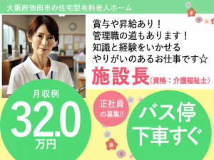 ≪池田市/サービス提供責任者(介護福祉士)/正社員≫★バス停下車スグ◆希望休3日あり◆賞与2.0ヶ月◆研修制度充実◆通勤手当上限なし★住宅型有料老人ホームでのお仕事です☆(osa)