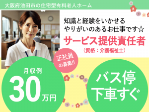 ≪池田市/サービス提供責任者(介護福祉士)/正社員≫★バス停下車スグ◆希望休3日あり◆賞与2.0ヶ月◆研修制度充実◆通勤手当上限なし★住宅型有料老人ホームでのお仕事です☆(osa)