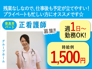 ≪奈良市/正看護師/パート≫★時給例1,500円◎週1~3日の勤務◎残業なし◎マイカー通勤可◎希望休あり★グループホームでのお仕事です☆(kyo)