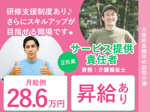 ≪高槻市/サ責(介護福祉士)/正社員≫★月給例28.6万円◎昇給あり◎賞与あり◎土曜日月2回休み◎★訪問介護のサ責のお仕事です☆(osa)
