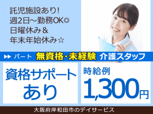 ≪岸和田市/無資格未経験OKの介護職/パート≫★経験不問◎時給例1,344円◎資格サポートあり◎託児施設あり◎週2日~勤務可◎日曜休み&年末年始休み★デイサービスでのお仕事です☆