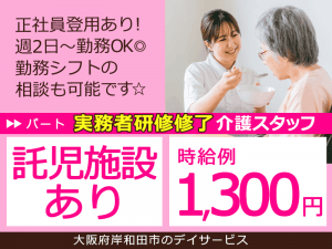 ≪岸和田市/実務者研修修了/パート≫★時給例1,344円◆週2日~勤務OK◆託児施設あり◆正社員登用あり◆勤務シフト相談可★デイサービスでのお仕事です☆