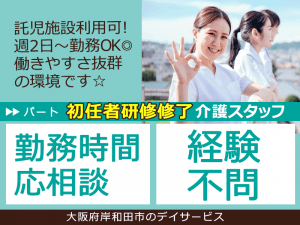 ≪岸和田市/初任者研修修了/パート≫★勤務時間応相談◎経験不問◎託児施設利用可◎時給例1,344円◎週2日~OK◎働きやすさ抜群の環境★デイサービスでのお仕事です☆