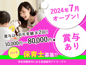 ≪橿原市/保育士/パート≫★賞与あり◎2024年7月オープン◎駅チカ◎時給例1350円★昇給あり★放課後デイサービスでのお仕事です☆(kyo)