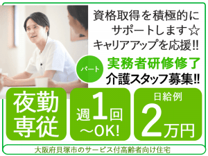 ≪貝塚市/実務者研修修了(夜勤専従)/パート≫★資格取得応援♪アットホームな職場♪夜勤専従♪手当充実♪日給2万円♪週1回~OK♪駅チカ♪WワークOK★サービス付高齢者向け住宅でのお仕事です☆