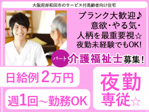 ≪岸和田市/介護福祉士(夜勤専従)/パート≫★週1回~OK◎日給例2万円◎夜勤専従◎◎駅チカ◎通勤手当支給◎マイカー通勤OK◎意欲・やる気・人柄を最重要視◎アットホームで働きやすい職場◎資格取得応援★サービス付高齢者向け住宅でのお仕事です☆
