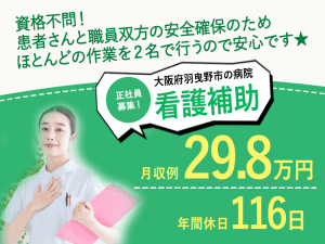 ≪羽曳野市/看護補助/正社員≫★年間休日126日◎月収例29.8万◎賞与あり◎昇給あり◎マイカー通勤OK◎職場見学OK★病院でのお仕事です☆(osa)
