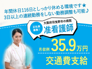 ≪羽曳野市/准看護師/正社員≫★年間休日116日◎月収例35.9万◎賞与あり◎食堂あり◎マイカー通勤OK◎夜勤あり★病院でのお仕事です☆(osa)