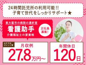 ≪東大阪市/看護助手(介護福祉士)/正社員≫★年間休日120日◇月収例27.8万円~◇退職金制度あり◇夜勤手当充実◇賞与3.2ヶ月◇職員食1食250円◇託児施設・入居可能住宅あり★病院でのお仕事です☆(osa)