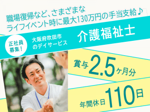 ≪吹田市/介護福祉士/正社員≫★賞与2.5ヶ月分◇年間休日110日◇月収例26.4万円~◇日勤のみ◇通勤手当支給◇退職金制度あり★デイサービスでのお仕事です☆(osa)