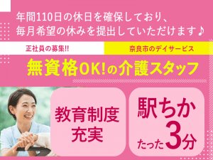 ≪奈良市/無資格介護職/正社員≫★駅からたった3分◎教育制度充実◎賞与2.5ヶ月分◎資格取得支援が充実◎年間休日110日◎驚きの充実手当★デイサービスでのお仕事です☆(kyo)