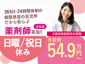≪岸和田市/薬剤師/正社員≫◆月収例54.9万円~◎日曜祝日休み◎年間休日108日◎さらに夏季休暇3日◎24時間利用可の託児施設あり◆病院でのお仕事です☆