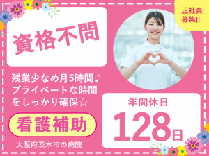 ≪茨木市/看護補助(資格不問)/正社員≫◆資格不問◎残業少なめ月5時間◎通勤手当上限10万円迄◎充実の年間休日125日◎託児施設あり◎就学支援手当◎◆病院でのお仕事です☆(osa)