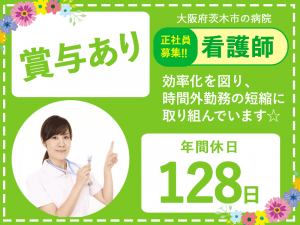≪茨木市/看護師/正社員≫◆年間休日125日☆賞与あり☆託児所あり☆月収例32.2万円~☆就学支援手当☆退職金制度あり◆病院でのお仕事です☆(osa)
