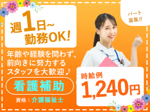 ≪茨木市/看護補助(介護福祉士)/パート≫◆時給例1,240円◎週1日~勤務OK◎勤務日時の相談可◎正社員登用実績あり◎交通費支給10万円まで◎送迎バス有◆病院でのお仕事です☆