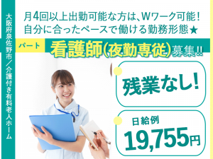 ≪泉佐野市/看護師(夜勤専従)/パート≫◆日給例19,755円♪残業なし♪Wワーク可♪勤務日相談OK♪通勤らくらく駅から3分♪食事補助付き◆介護付き有料老人ホームでのお仕事です☆
