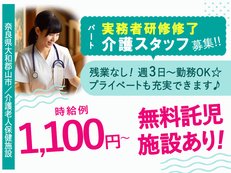 ≪生駒郡/実務者研修修了/パート≫◆賞与寸志あり☆時給例1,100円~◇週3日~OK◇マイカー通勤OK◇残業なし◇子育て世代も働きやすい◇無料託児施設あり◆介護老人保健施設でのお仕事です☆(kyo)