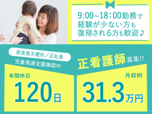 ≪天理市/正看護師/正社員≫★年間休日120日◎月収例31.3万円◎資格活かせる◎賞与あり◎昇給あり★児童発達支援施設でのお仕事です☆(kyo)