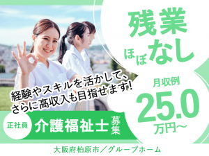 ≪柏原市/介護福祉士/正社員≫◆残業ほぼなしで働きやすい♪月収例25.0万円~♪交通費支給!上限なし♪各種手当が充実♪昇給もあり◆グループホームでのお仕事です☆(osa)