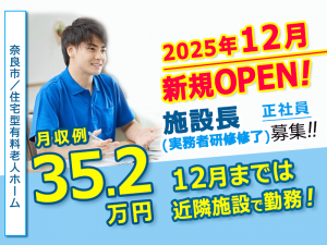 ≪奈良市/施設長(実務者研修修了)/正社員≫◆◆2025年12月オープンの施設♪希望休月3日あり♪月9日休み♪賞与2.0ヶ月分♪経験を活かして施設長に挑戦◆◆住宅型有料老人ホームでのお仕事です☆(kyo)