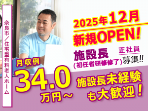 ≪奈良市/施設長(初任者研修修了)/正社員≫◆新規オープン2025年12月◇月9日休み◇研修制度充実◇賞与2.0ヶ月分◇資格取得サポートあり◆住宅型有料老人ホームでのお仕事です☆(kyo)