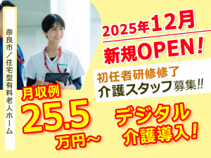 ≪奈良市/初任者研修修了/正社員≫◆デジタル介護導入施設◎月収例25.5万円~◎資格取得支援◎6年に渡り毎年5,000円昇給☆2025年12月OPEN予定◆住宅型有料老人ホームでのお仕事です☆(kyo)