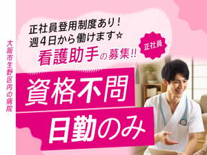 ≪大阪市生野区/看護助手(無資格OK) /パート≫★時給1,400円♪日勤のみ♪週4日から働ける!フレキシブルな勤務日設定可能♪正社員登用制度ありで、安心のキャリアサポート!★病院でのお仕事です☆