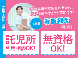 ≪大阪市平野区/看護補助者(無資格)/正社員≫★☆無資格OK◎託児施設ありで子育て中の方も安心♪駅チカ!徒歩1分でラクラク通勤♪皆勤手当別途あり◎月収例25.2万円☆★病院でのお仕事です☆(osa)